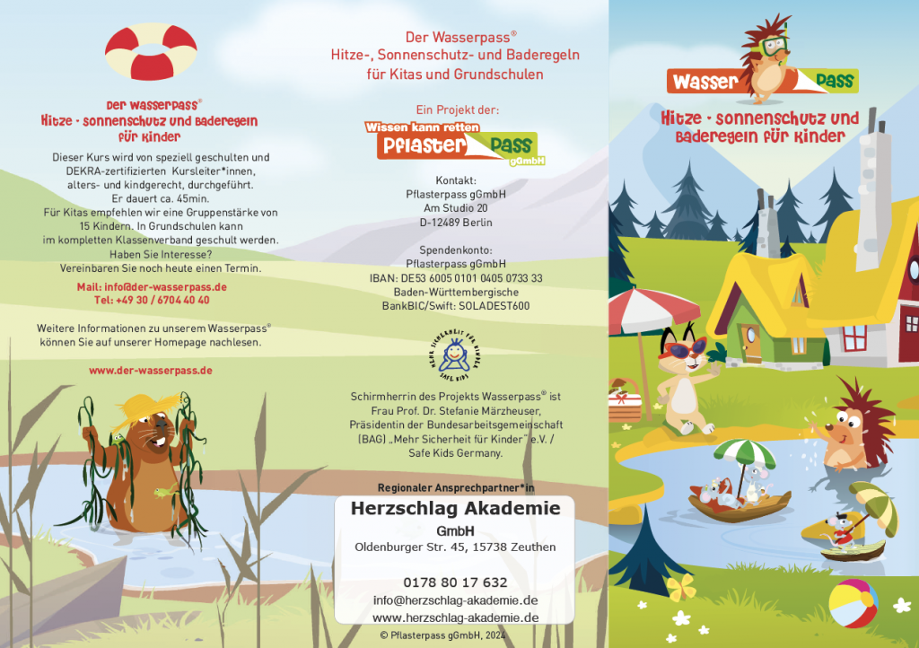 Im Wasserpass® lernen Kinder altersgerecht, wie sie sich bei Hitze und Sonneneinstrahlung schützen und welche Regeln für sicheres Verhalten am und im Wasser gelten. Thematisiert werden unter anderem ausreichendes Trinken, Sonnenschutz, Gefahren durch Hitze und UV-Strahlung sowie die offiziellen Baderegeln. Spielerisch vermittelt werden außerdem richtiges Verhalten an Gewässern, in Pools und im Notfall. Geschichten, anschauliche Beispiele und interaktive Elemente fördern das Gefahrenbewusstsein, die Selbstschutzkompetenz und sicheres Handeln im Alltag.